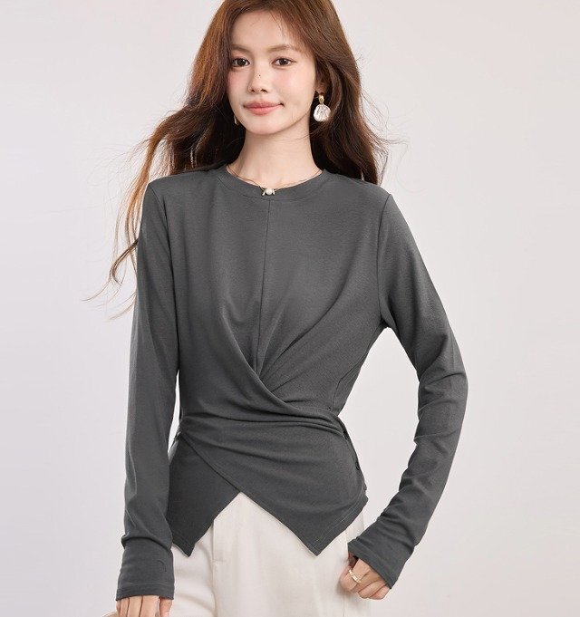 - 長袖Tシャツ アシンメトリー 切り替え スリム 着痩せ M ダークグレー