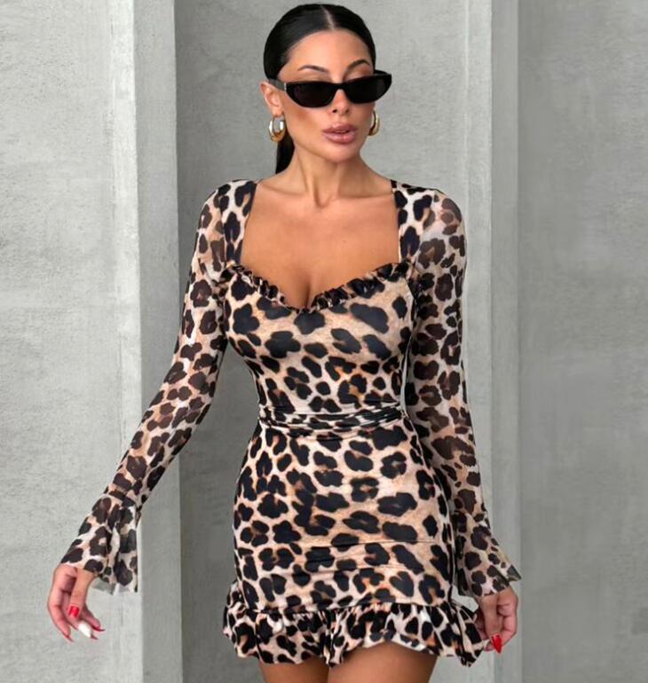 - M1016 ワンピースレディース● 着心地抜群 20代30代40代 ● 新作 長袖 sexy ミニ丈 豹柄