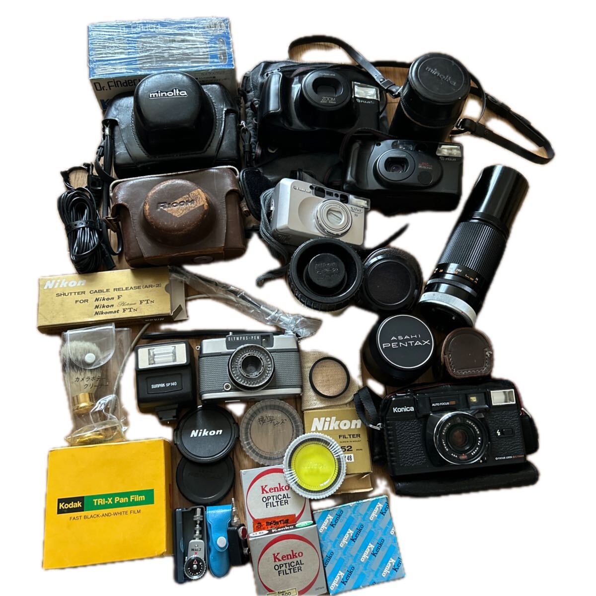 > カメラ 大量 まとめ ジャンク●Canon コニカ ミノルタ PENTAX FUJI●ズームレンズ フィルター ケーブルレリーズ ストロボ 白黒フィルム