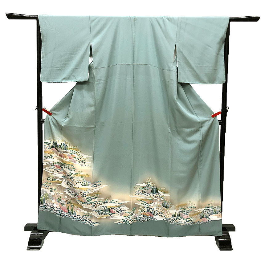 - 京やE017 正絹 留袖 色留袖 ちりめん 四季の草花 一つ紋 仕立て上がり フォーマル着物 未使用 新古品
