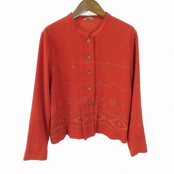 - #a サンネンザカ 三年坂 シャツ ブラウス M 赤系 マルチ スタンドカラー 長袖 ちりめん 和風 日本製 レディース [953084] k01