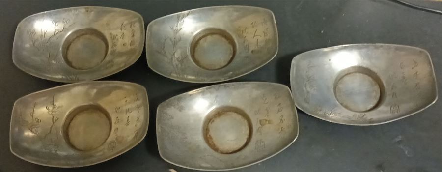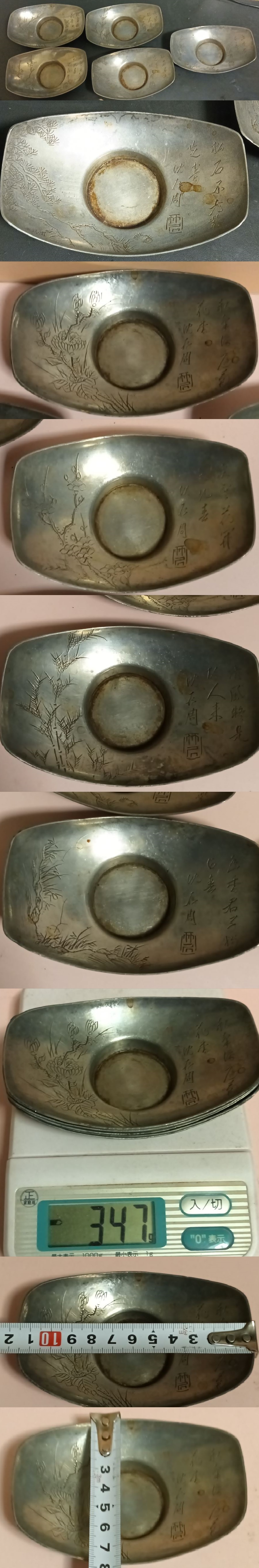 中国 清代 沈存周 刻 煎茶図彫 梅蘭竹菊松 五君子 図替 唐物 古錫 船形 茶托 五客