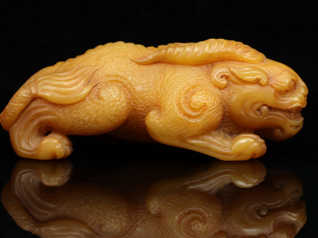 - ▽鴻▽金石篆刻 白石銘 寿山田黄石彫 瑞獣紋彫り件 共箱 時代物 中国古美術 骨董品