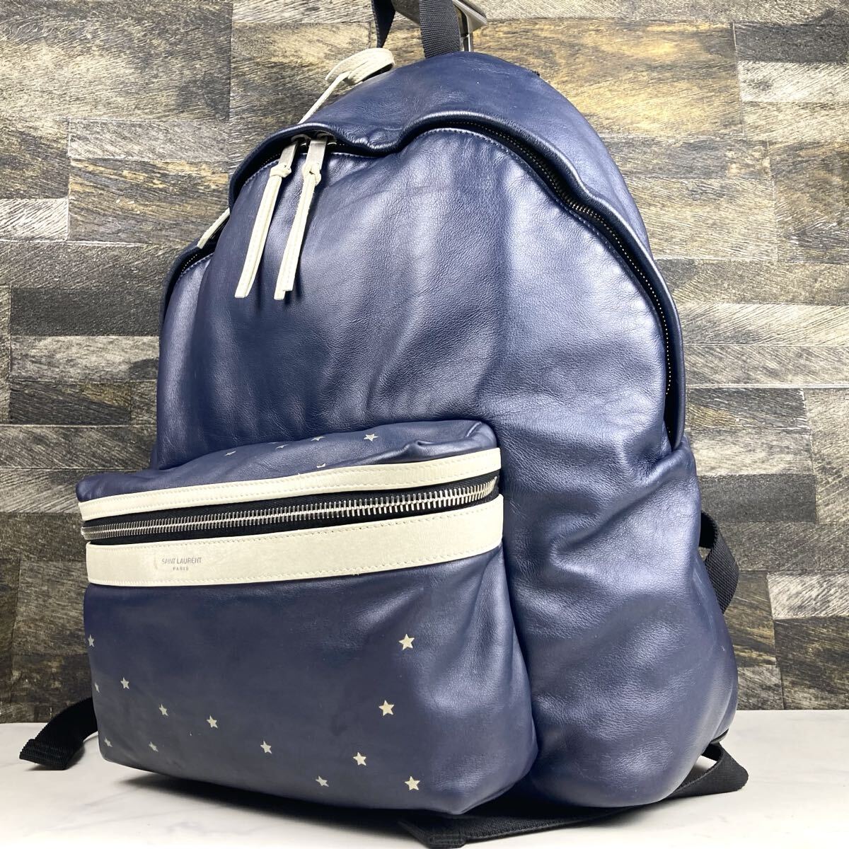 > 美品 Saint Laurent PARIS サンローランパリ リュック バックパック シティ レザー 革 ネイビー 白 ホワイト バイカラー 星 スター 大容量