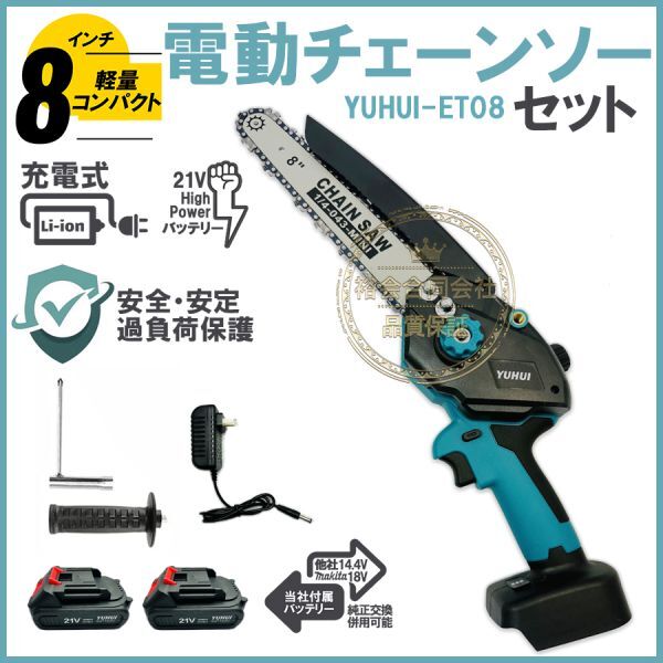 - ★送料無料・30日間保証付き★充電式 電動チェーンソー 8インチ 小型 チェンソー 家庭用 片手 軽量 木工切断 枝切り バッテリー2個付き