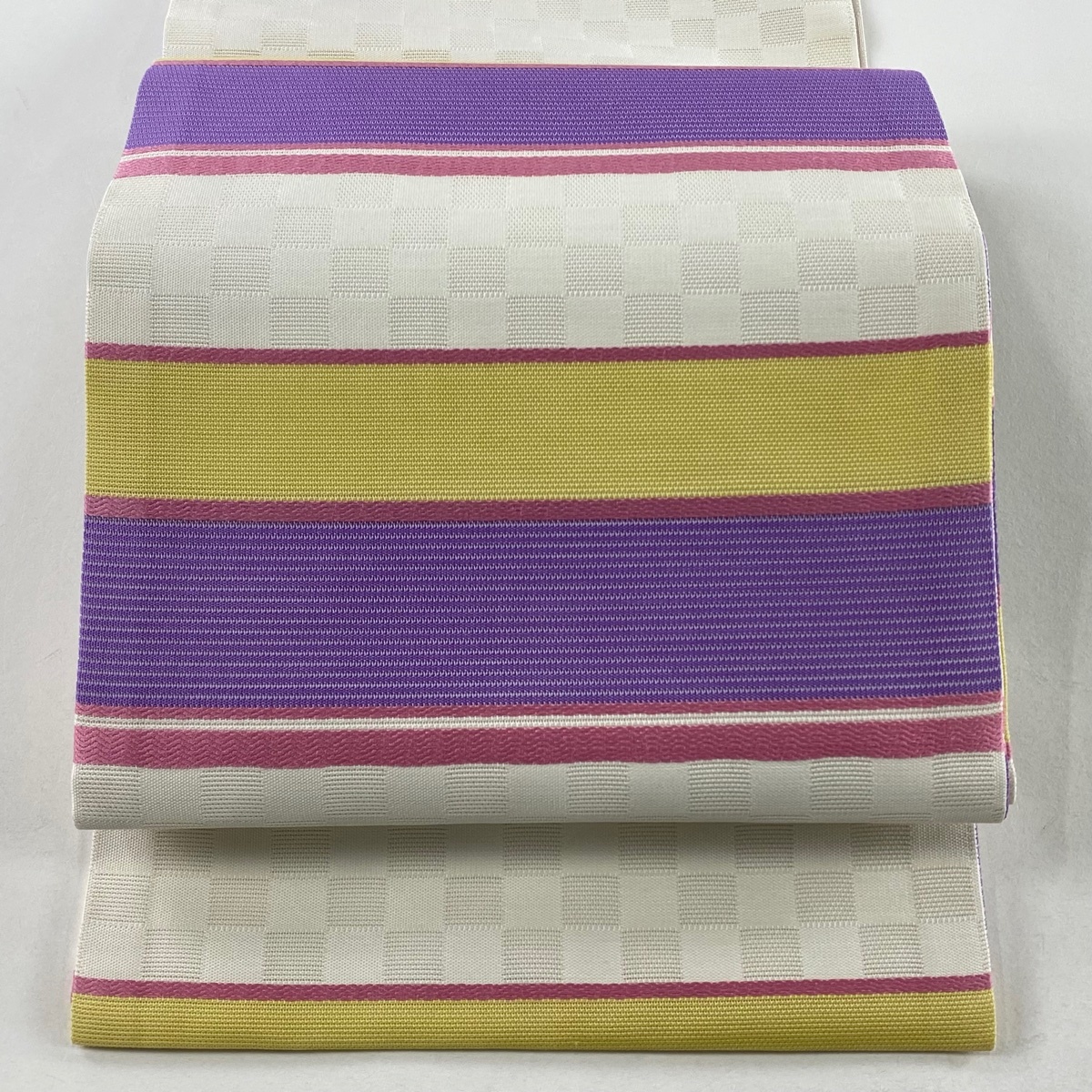- 【美品】 開き名古屋帯 秀品 段縞 市松 紫 正絹 【中古】