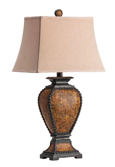 鋳造樹脂製のボディに、まるで本革のような質感と渦巻き模様が施されたクラシカルなテーブルランプ。