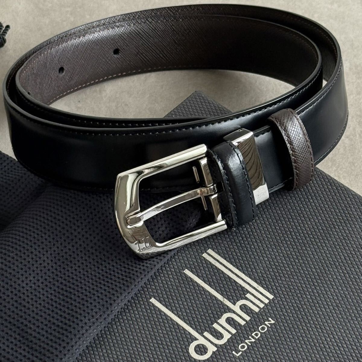 > 極美品/現行モデル●dunhill ダンヒル リバーシブル 2way レザーベルト シルバーバックル ロゴ ブラック 黒 茶 ビジネス メンズ 付属品付き