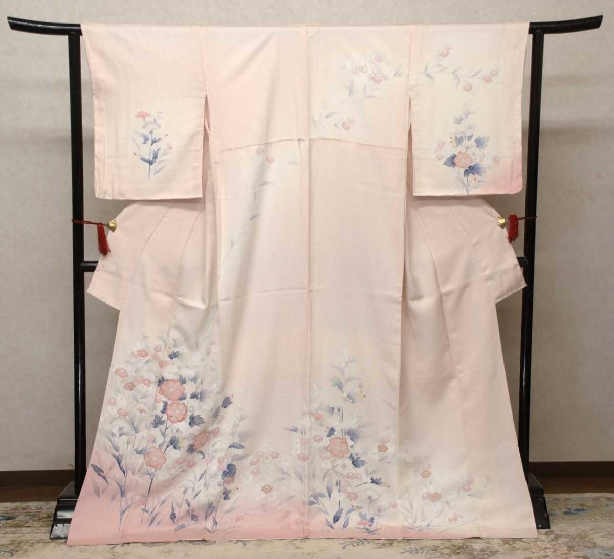 - ☆訪問着☆薄い桃色 アザミや椿などの花文 正絹 裄65cm 大きめ☆未使用☆残布付