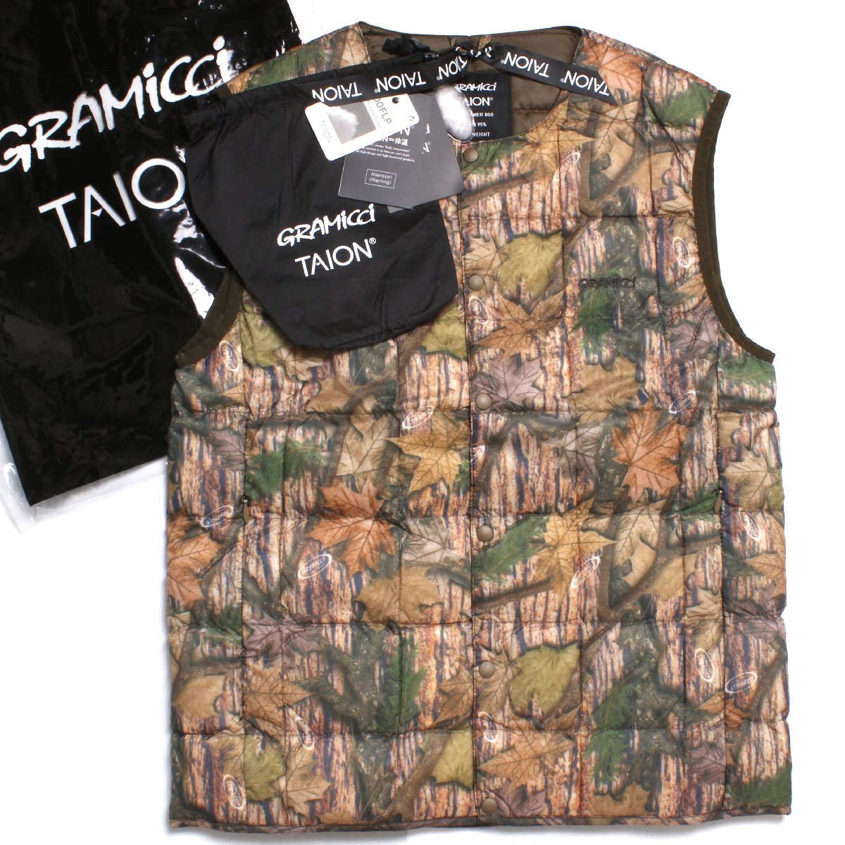 > 23AW【タグ付・新品・定価9,900円】GRAMICCI×TAION INNER DOWN VEST XS LEAF CAMO G3FU-J100-TG グラミチ タイオン ベスト ユニセックス