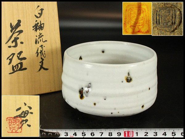 - 【金閣】茶道具 西川実造 白釉流飛文 茶碗 共布 共箱 京焼 和食器 しおり 美品 旧家蔵出 送料無料(YC485)