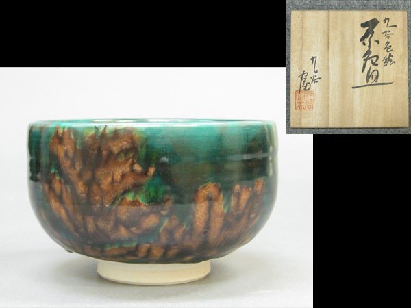 - 【心庵】九谷焼 美山富 緑釉樹木文/茶碗 共箱 陶歴 師: 浅蔵五十吉 A719