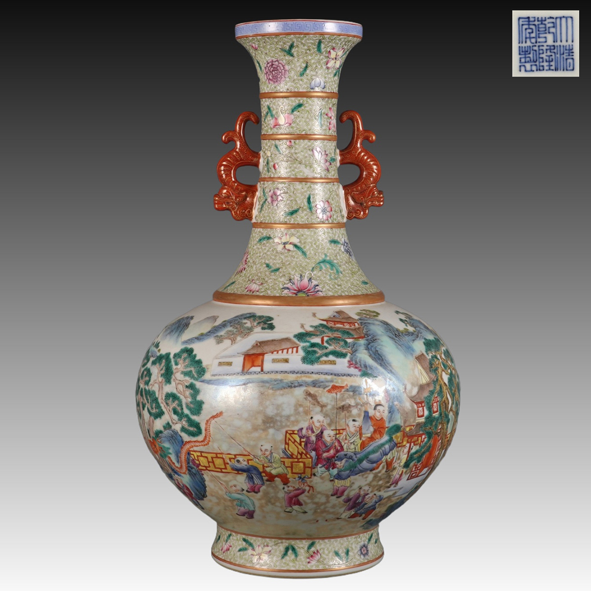 - ▽鴻▽清時代 陶磁器 大清乾隆年製 粉彩百子図双耳賞瓶 箱付 時代物 中国古美術 骨董品