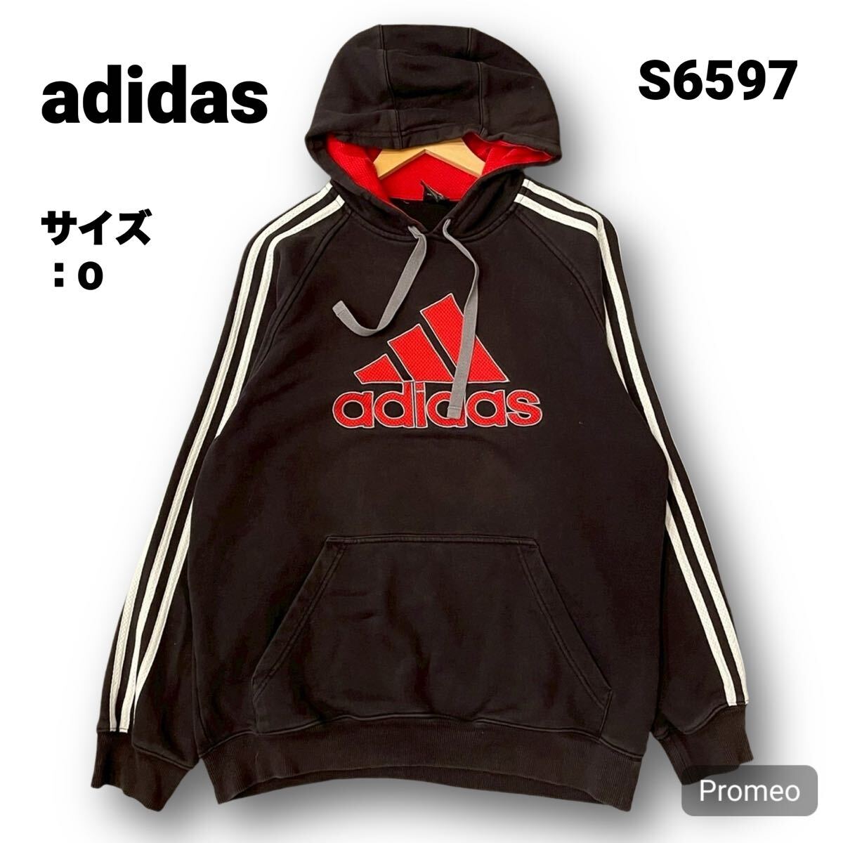 > 【S6597】 adidas アディダス パーカー プルオーバー サイズO ブラック 黒 フロントロゴ 刺繍ロゴ メンズ トップス 最落なし 古着