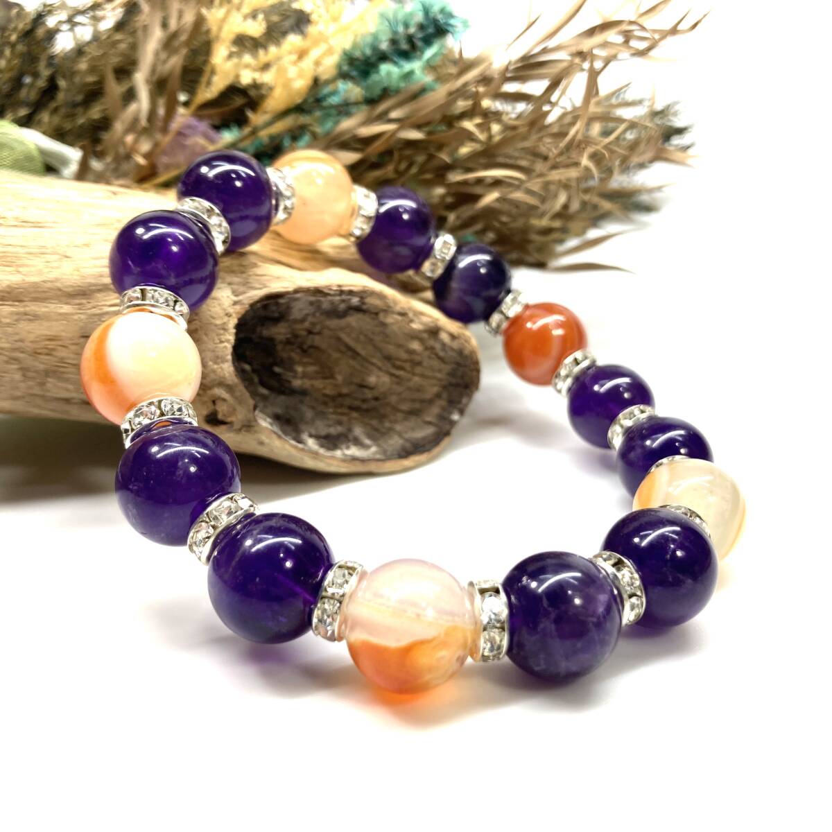 > カーネリアン・サードニクス 天眼石 &アメジスト パワーストーン ブレスレット 天然石 (シルバー) 12mm メンズ・レディース 男性 女性