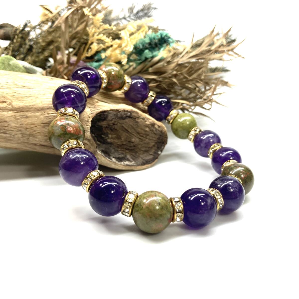 > ユナカイト&アメジスト パワーストーン ブレスレット 天然石 (ゴールド) 12mm 金運 仕事運 メンズ・レディース 男性 女性