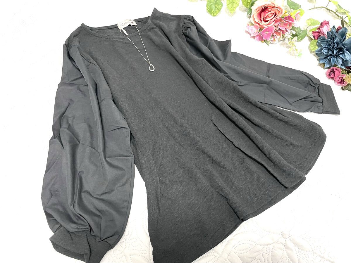- f■3L■新品■ナチュラルカジュアル*ボリューム袖*布帛素材 Tops*裾ラウンド*異素材デザイン■黒