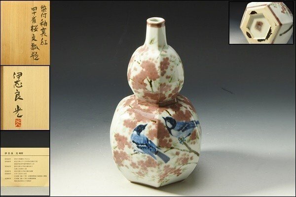 > U07801 東京芸大 伊志良光 染付 釉裏紅 四十雀 桜文 瓢瓶 徳利 花器 共箱 /桜
