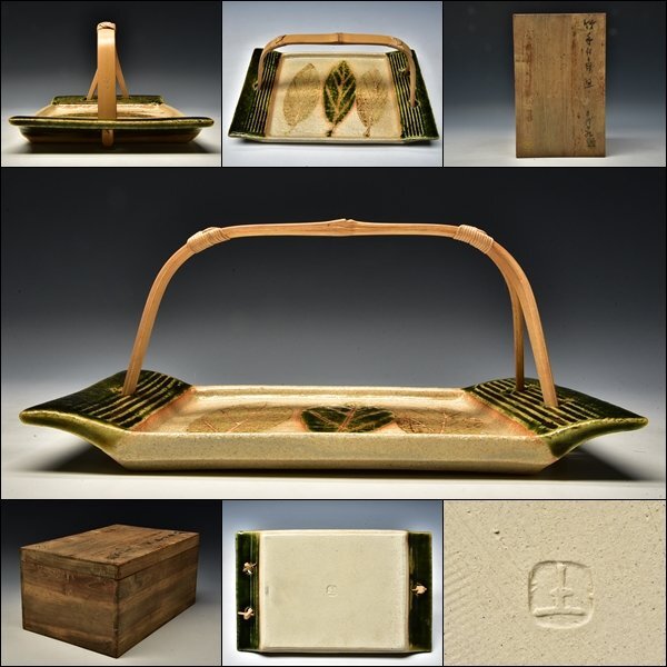 - YK00449 人間国宝 加藤土師萌 竹手付 角皿 共箱