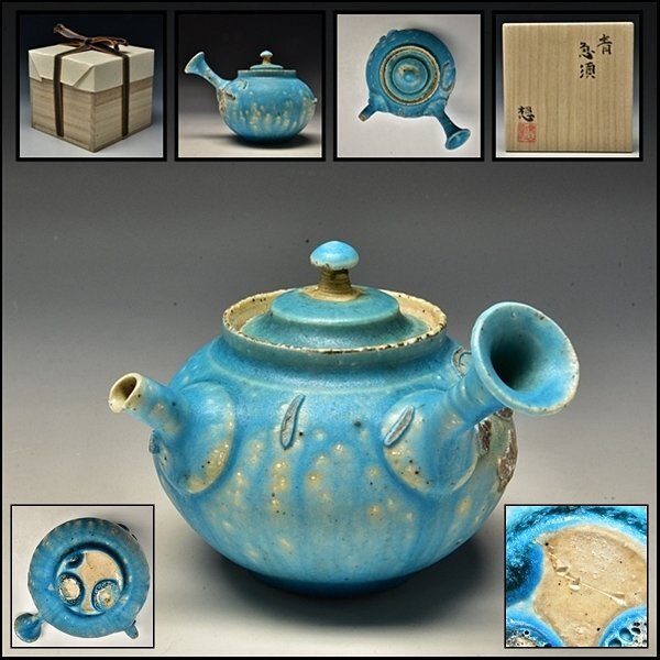 - U08967 山田想 青 急須 横手 茶器 煎茶 茶道具 共箱 師 祖父 人間国宝 三代 山田常山
