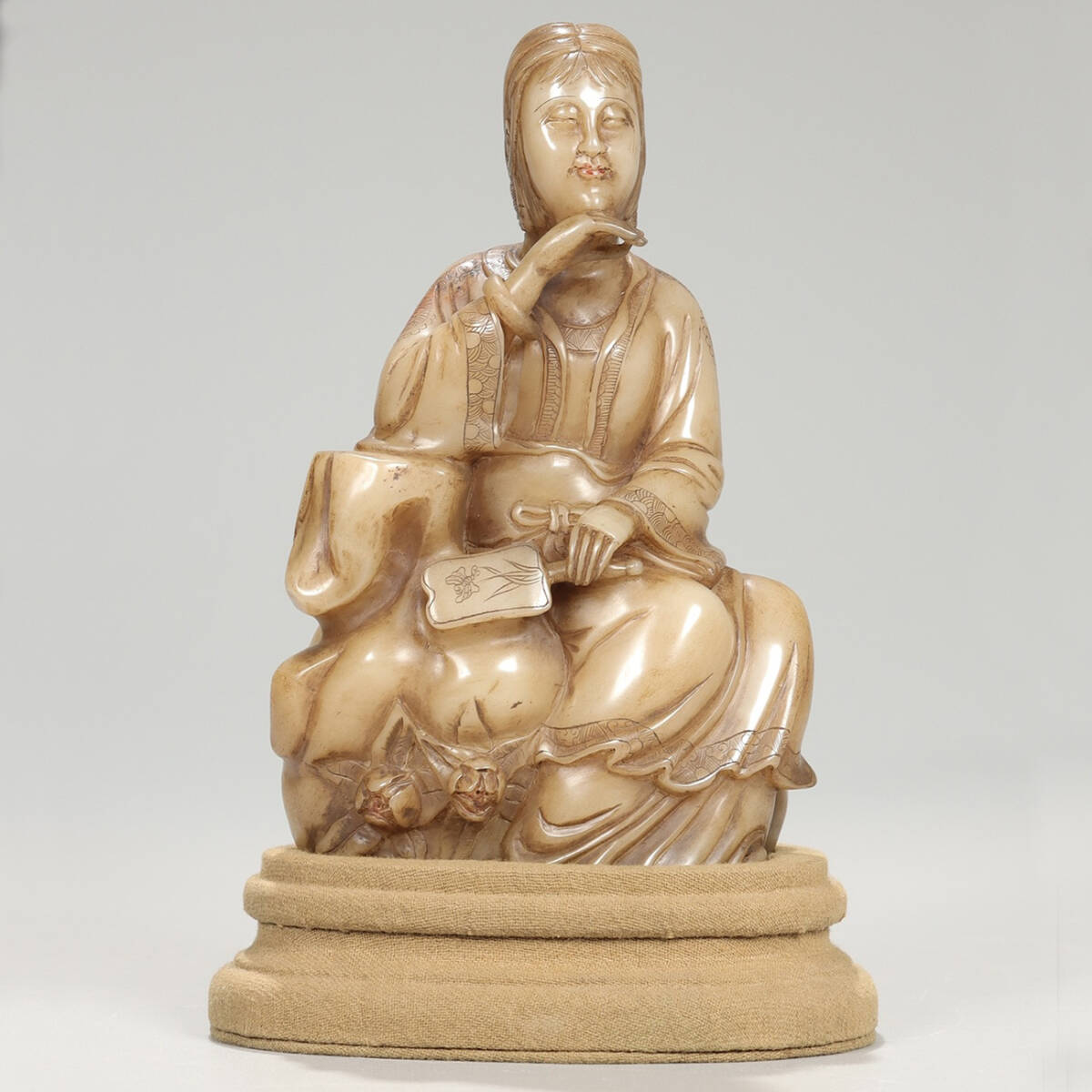 - ▽鴻▽清朝時代 寿山石彫 仕女置物 玉セン作 箱付 時代物 中国古美術 骨董品