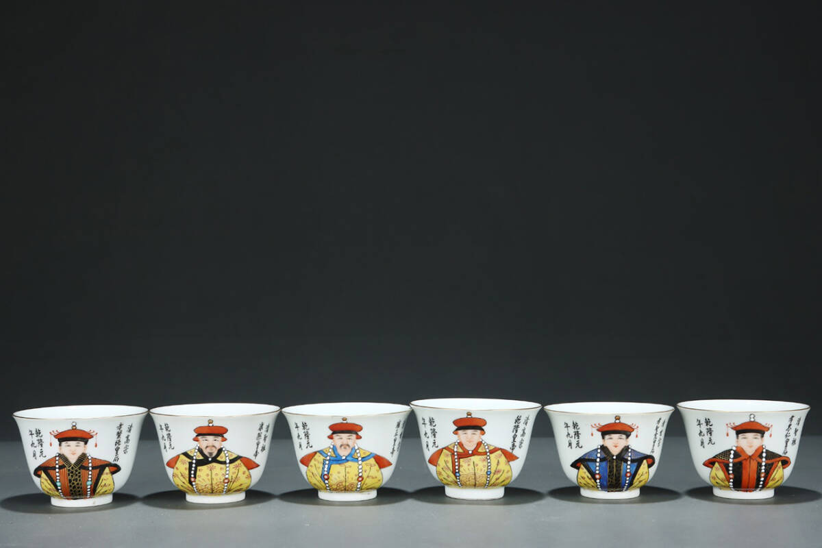 - ▽鴻▽清朝時代 陶磁器 琺瑯彩皇帝像杯セット 6点 清乾隆御製款 箱付 時代物 中国古美術 骨董品