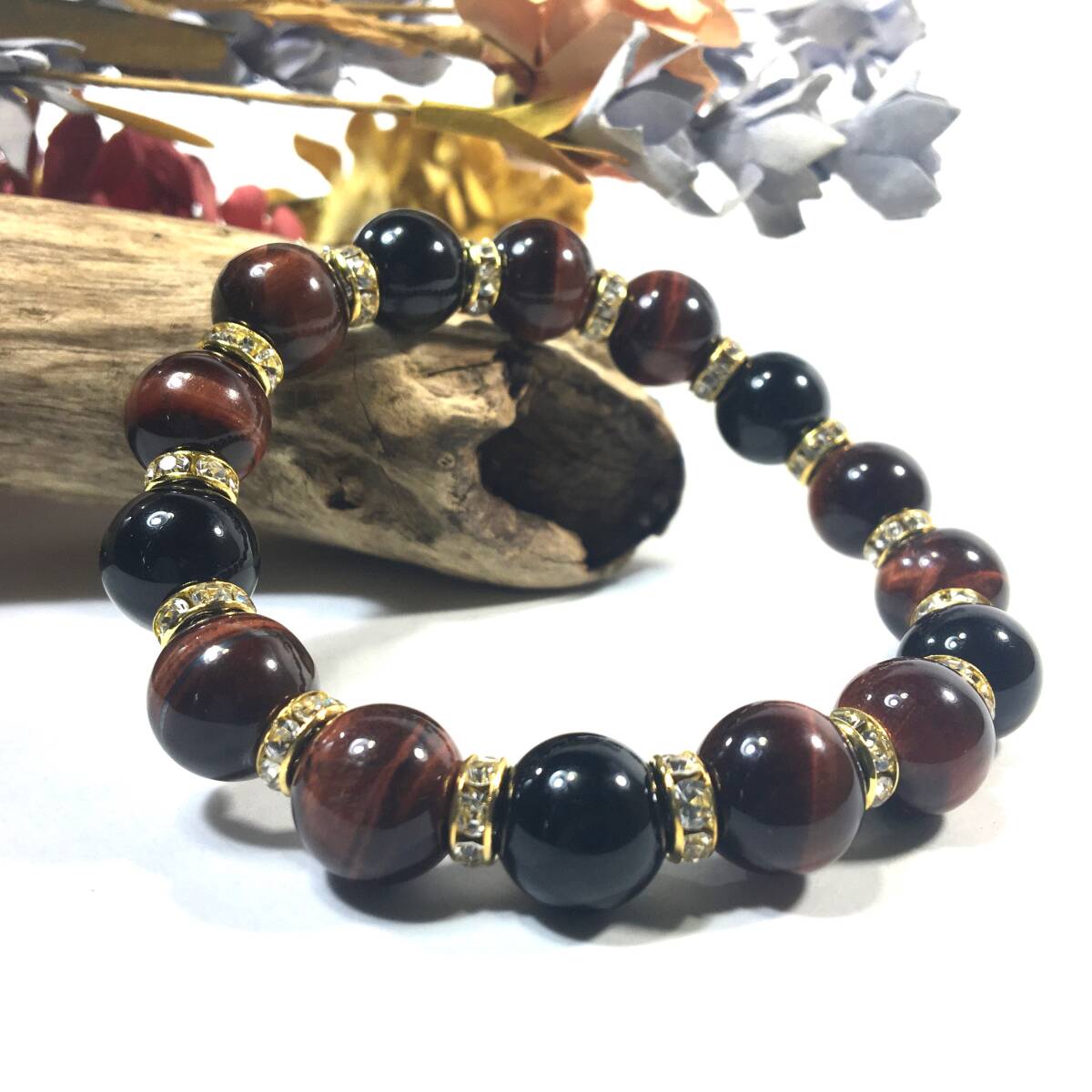 - レッドタイガーアイ&オニキス パワーストーン ブレスレット 天然石ブレス (ゴールド) 12mm 幸運 開運 メンズ 男性♪
