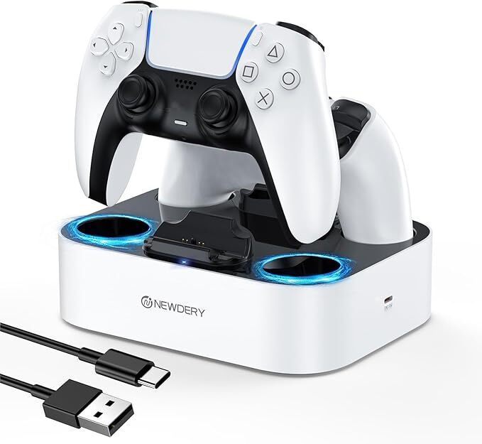 - PS5 コントローラー 充電スタンド 急速充電 2台同時充電可能 置くだけ充電可能 過充電防止 USB-Cケーブル付属 LED指示ランプ付き ホワイト