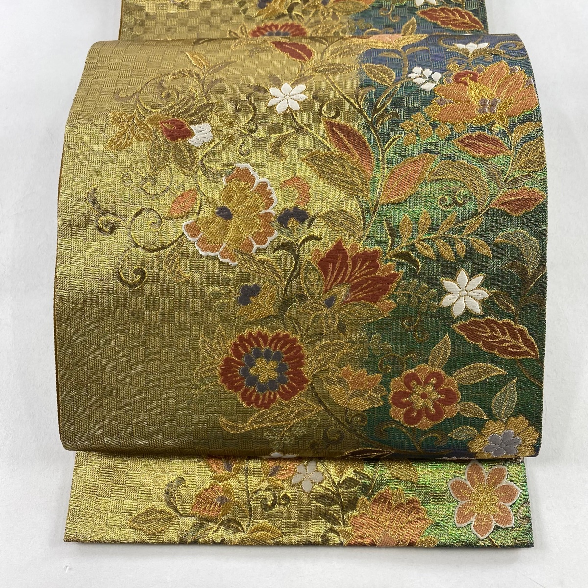 > 袋帯 秀品 振袖向き 更紗 金糸 ラメ箔 金色 六通 正絹 【中古】