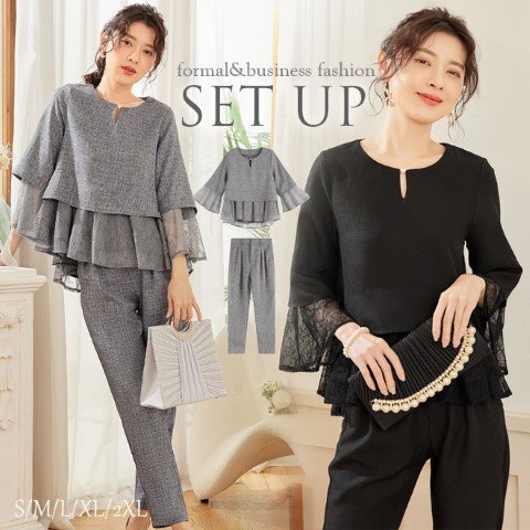 - セットアップ ロングパンツ スーツ 入学式 卒業式 フォーマル 結婚式 ドレス 上品 大人 レース M ブラック