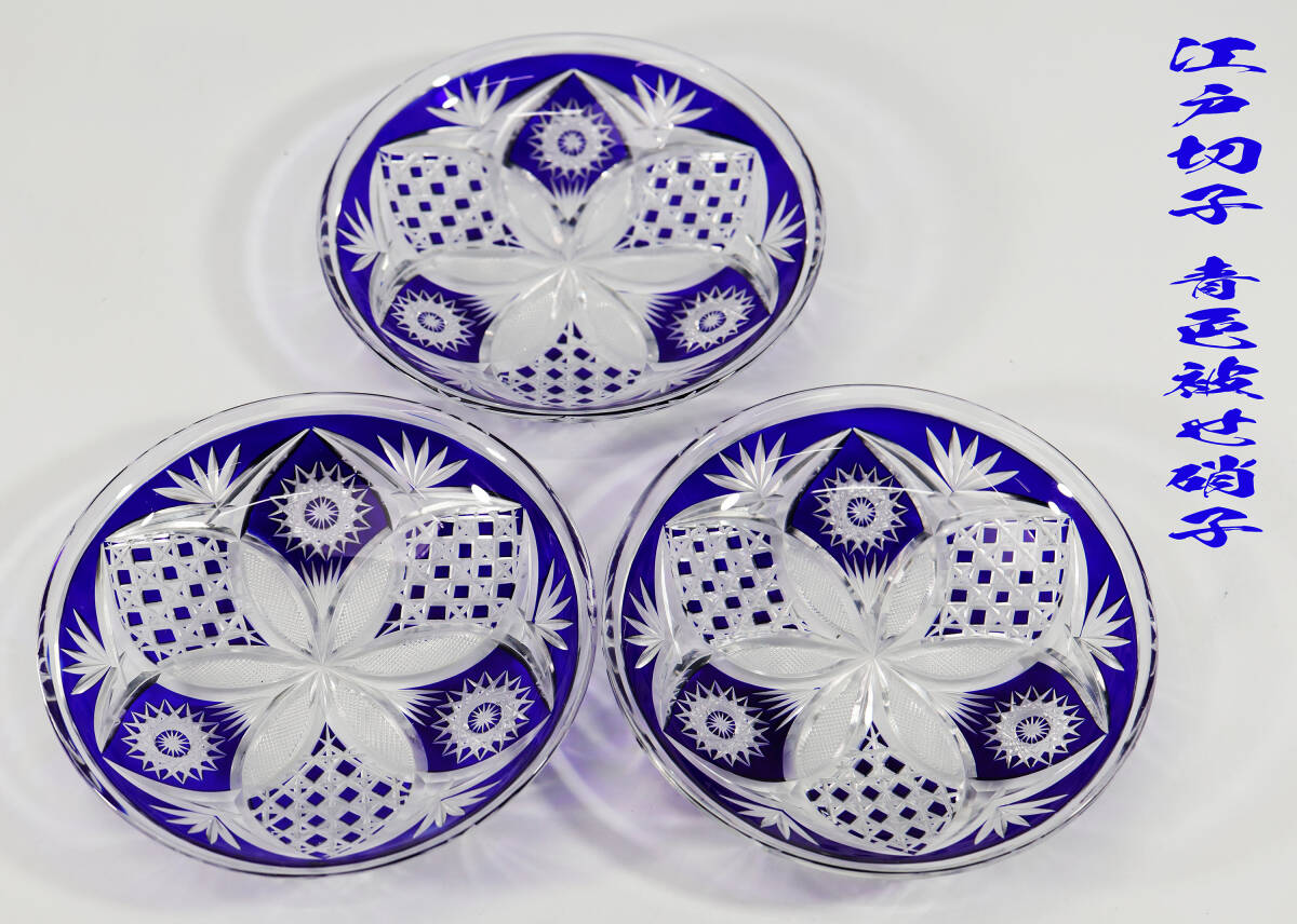 - 江戸切子 青色被せガラス 皿 3客 ブルー カット ガラス