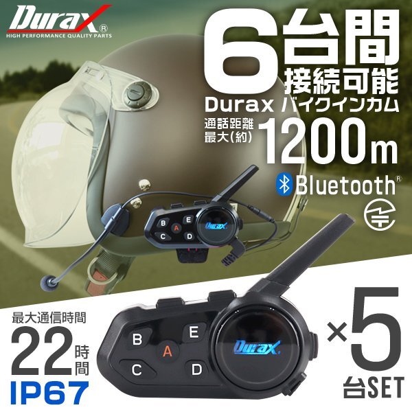 - 【5台セット】バイク インカム イヤホンマイク 1200m通信 最大6人接続 無線機 トランシーバー Bluetooth ワイヤレス 防水 ハンズフリー