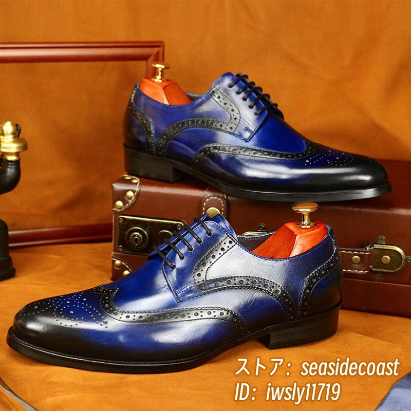 > 定価11万◆最高級 牛革 ビジネスシューズ 本革 レザーシューズ 職人手作り 手塗り上げ 紳士靴 フォーマル 革靴 冠婚葬祭 ブルー 25.5cm