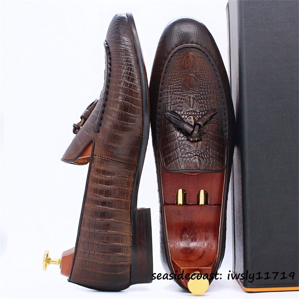 - 定価10万超★本革 超希少 鰐柄 ビジネスシューズ 職人手作り 本牛革 レザーシューズ タッセル スリッポン ローファー 革靴 ブラウン 28.0cm