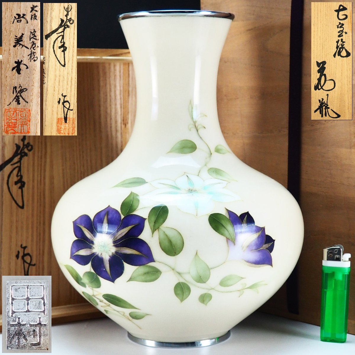 > 【治】日本工芸会員『田村幸夫』造 尚美堂監修 銀縁 鉄仙花紋七宝花瓶☆共箱 高さ 27.8cm (検索:置物 花入 壷 安藤七宝)本物保証 JJ15