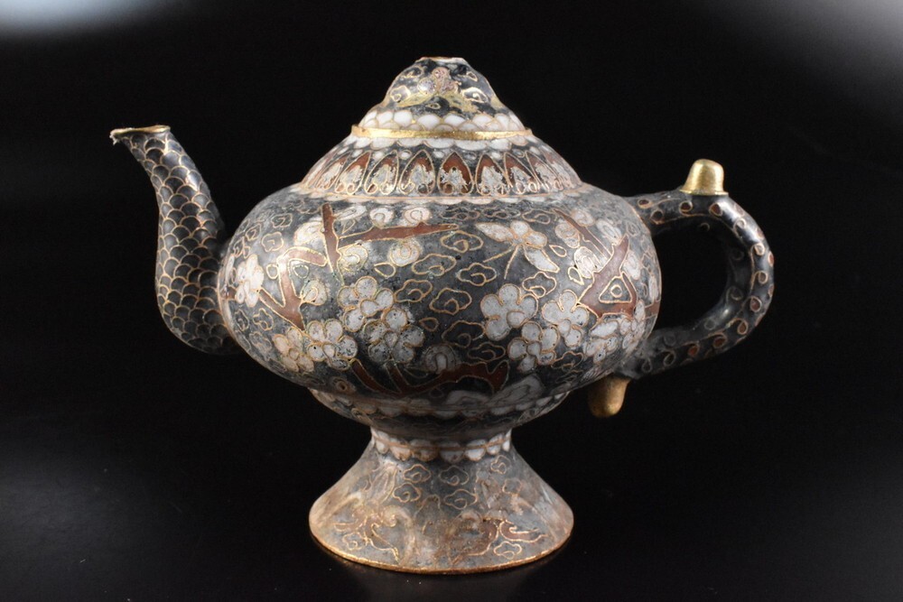 - 【雲】某収集家買取品 銅製 七宝 花彫刻急須 古美術品(茶道具煎茶道具) F8315