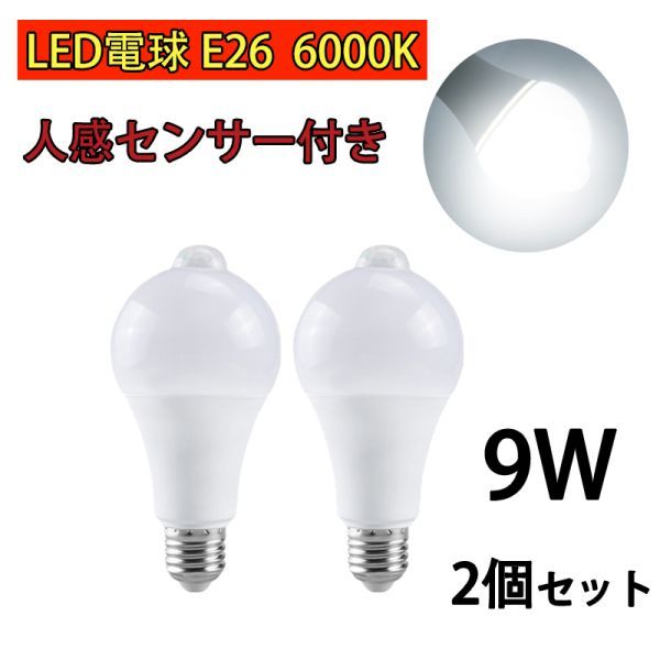 > LED電球 人感センサー付 E26 9W ホワイト 昼光色 6000k 80W相当 明暗センサー付 自動点灯/消灯 省エネ 廊下灯 玄関灯 洗面所 2個set N541