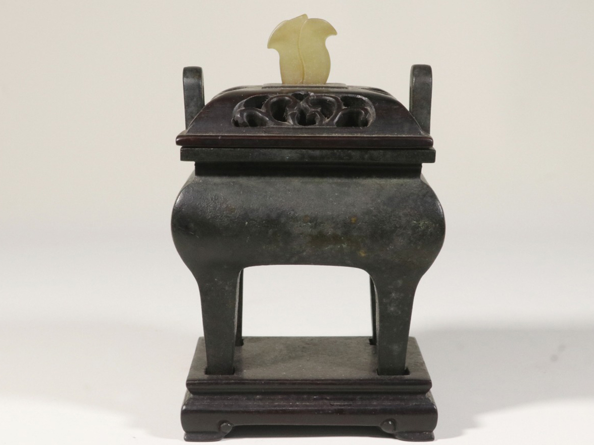 - ▽鴻▽清朝時代 古銅彫 双耳高足香薫炉 和田玉摘鈕 紫檀木蓋台 玉堂清玩 時代物 中国古美術 骨董品