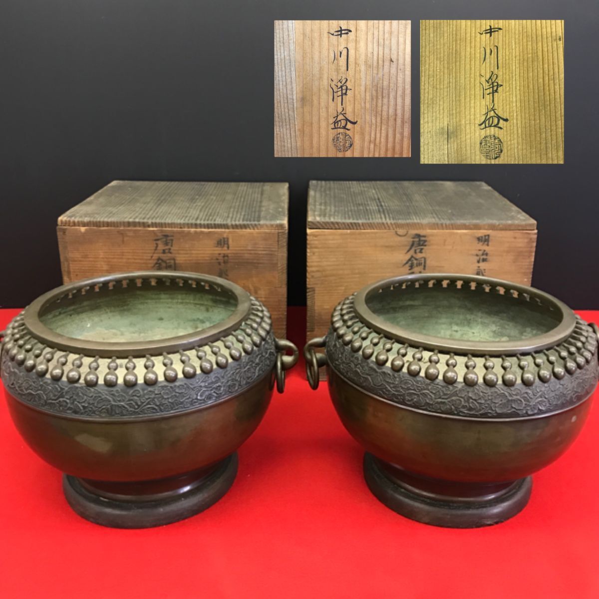 - 唐銅軌単透火鉢 一対 中川浄益作 共箱 【RA0900T#160】
