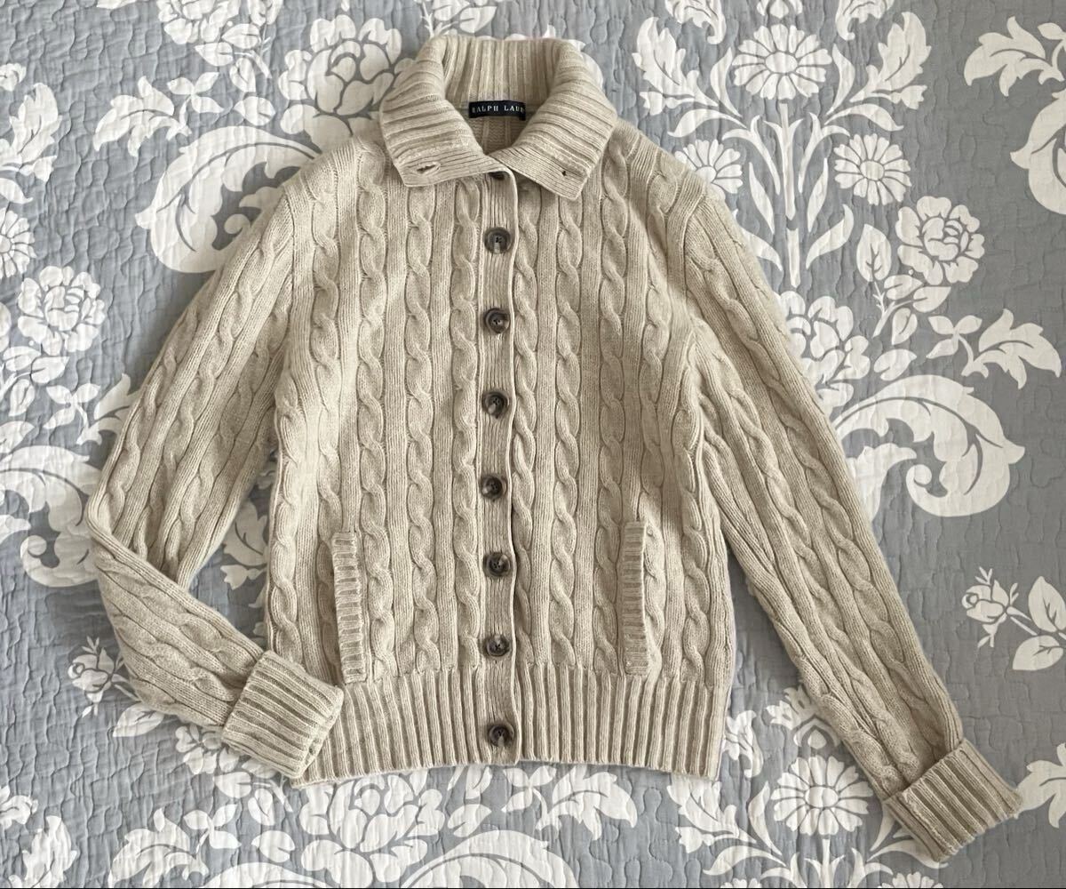 > ラルフローレン カシミヤ入り カーディガン 襟付き ケーブル 縄編み ベージュ ポケット 羊毛 ウール