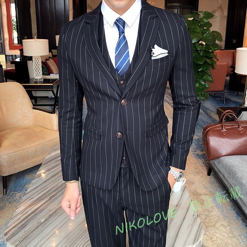 > ☆新品スリーピース スーツセット ストライプ柄 メンズ 結婚式 3点セット スタイリッシュ 二つボタン 細身スリム 微ストレッチ 黒 S~4XL