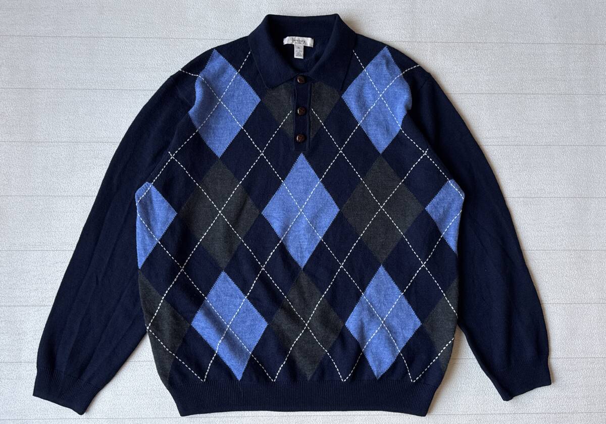 - ☆送料無料☆ Turnbury USA直輸入 古着 長袖 アーガイル柄 メリノウール オーストラリア製 ニット ポロシャツ メンズ XL ネイビー 中古