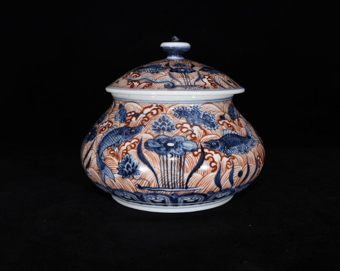> 【永】明時代 大明宣德年製 紅彩青花魚藻紋罐 古陶磁器 陶芸 皿 中国陶瓷器 唐瓷 置物擺件 古美術品 古賞物 収集 旧家蔵出 中国唐物 A24