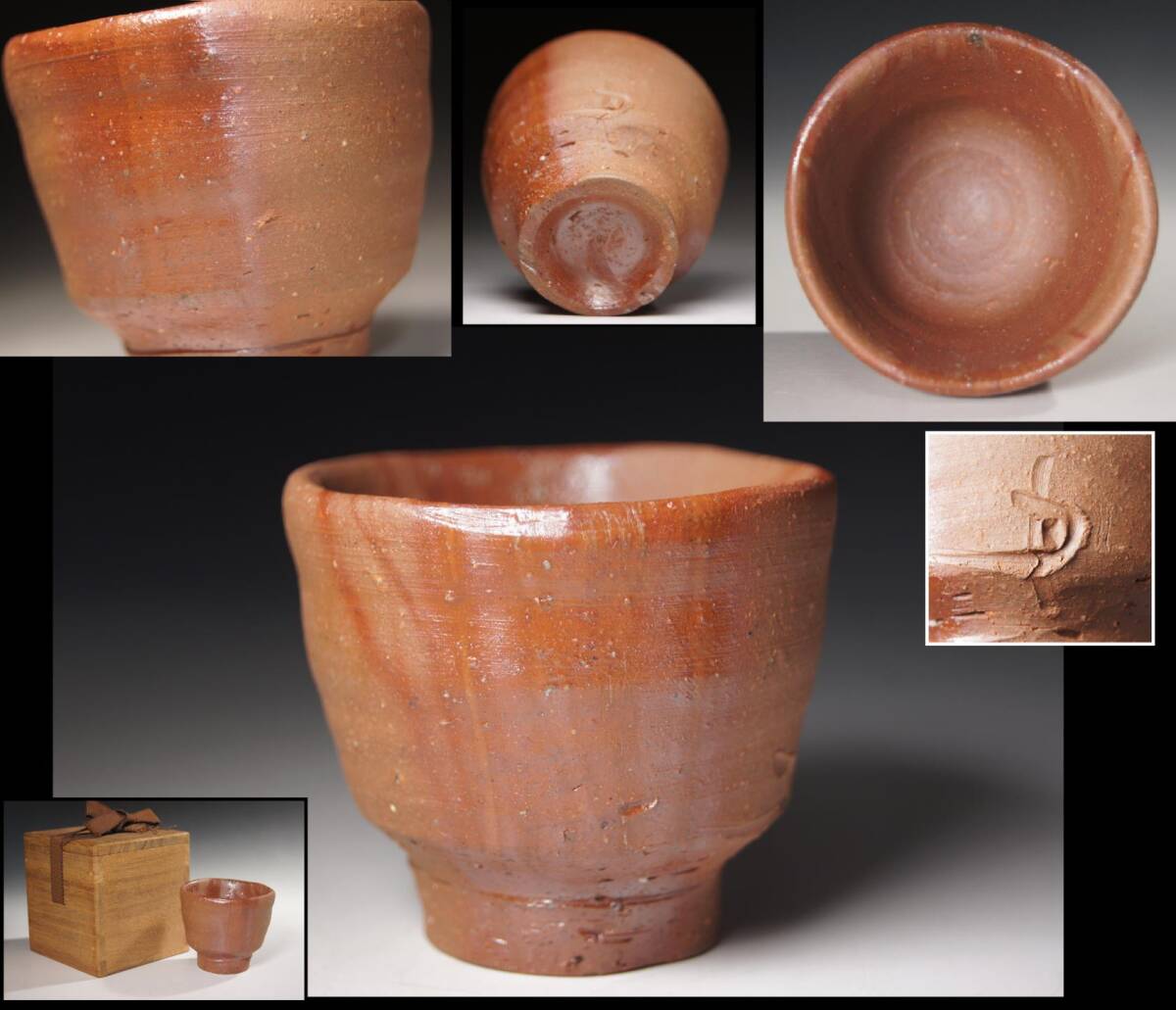 > 【藤原建 作】備前 緋襷 ぐい呑 合せ箱 窯変 ヒダスキ 火襷 北大路魯山人・金重陶陽に師事 叔父は人間国宝 藤原啓 酒器 酒杯 酒盃 真作