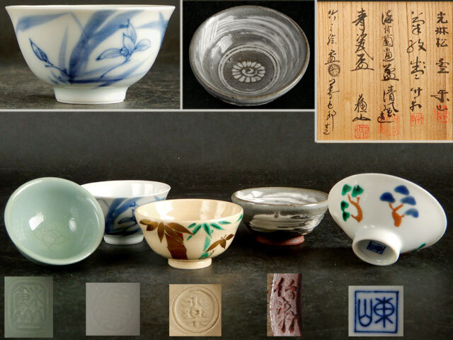 > 京焼名工盃 五客 清風与平・染付蘭画/永楽善五郎・竹の絵/諏訪蘇山・青磁/三浦竹軒・菊紋/宮永東山・光琳松