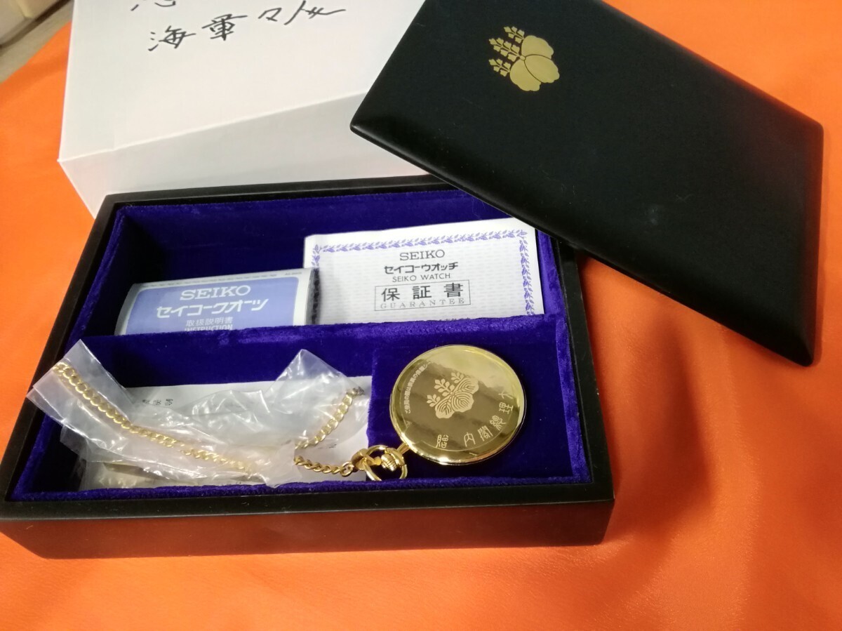 > g_t H778 ☆セイコー SEIKO 懐中時計 純正チェーン 贈 内閣総理大臣 ゴールドカラー 会津塗小筥箱付き 未使用長期保管品 不稼動 現状品