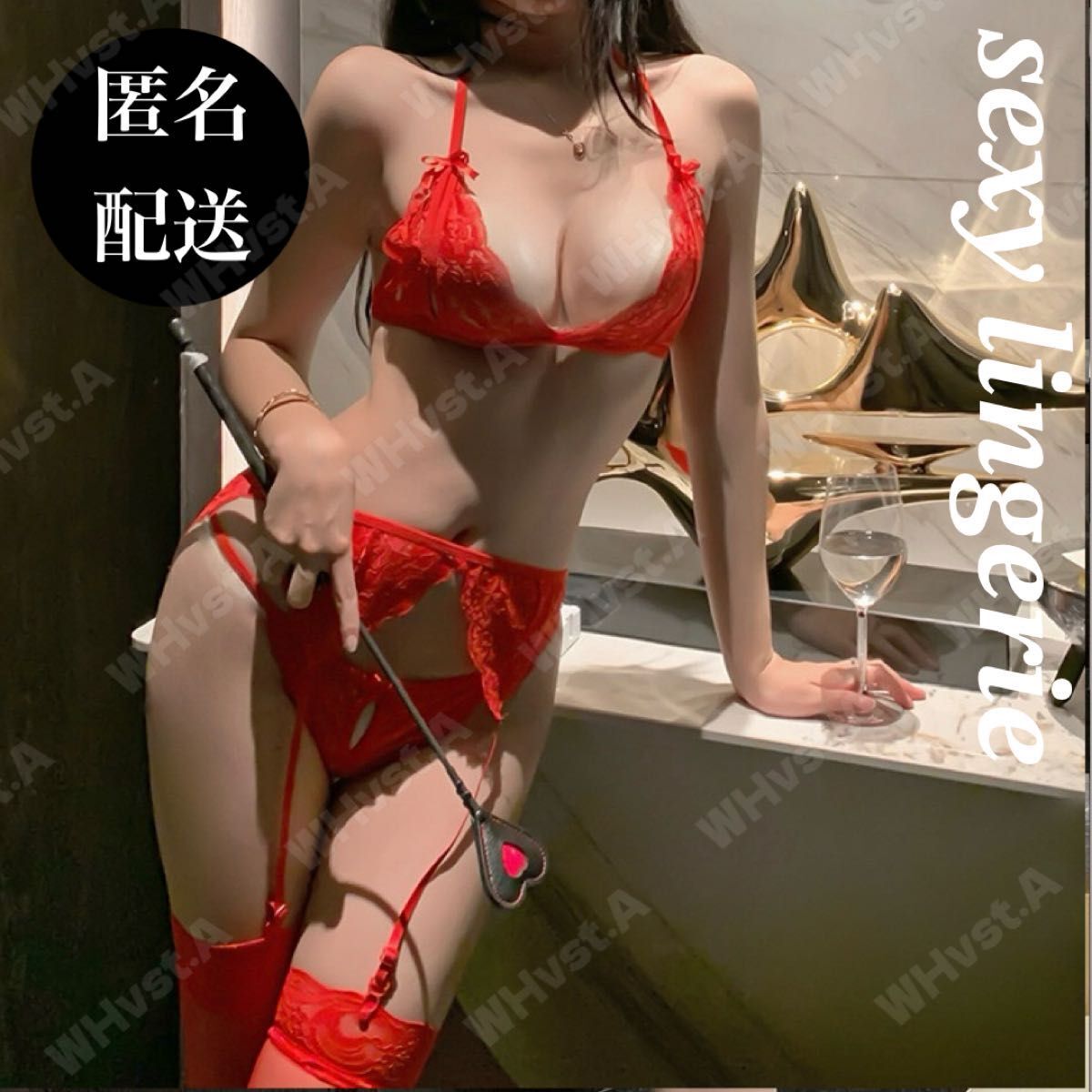 - レッド セクシー ランジェリー 4点セット ガーターベルト 穴あき ブラ ショーツ 赤 ストッキング
