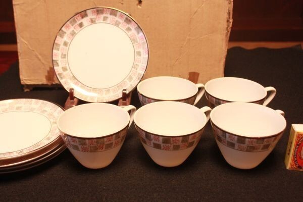 > 【新品未使用】★美品 レトロ食器『マルサ陶器 幾何学文カップ&ソーサー5客セット』★検:(洋食器/贈答品/昭和/アンティーク/当時物)0424I