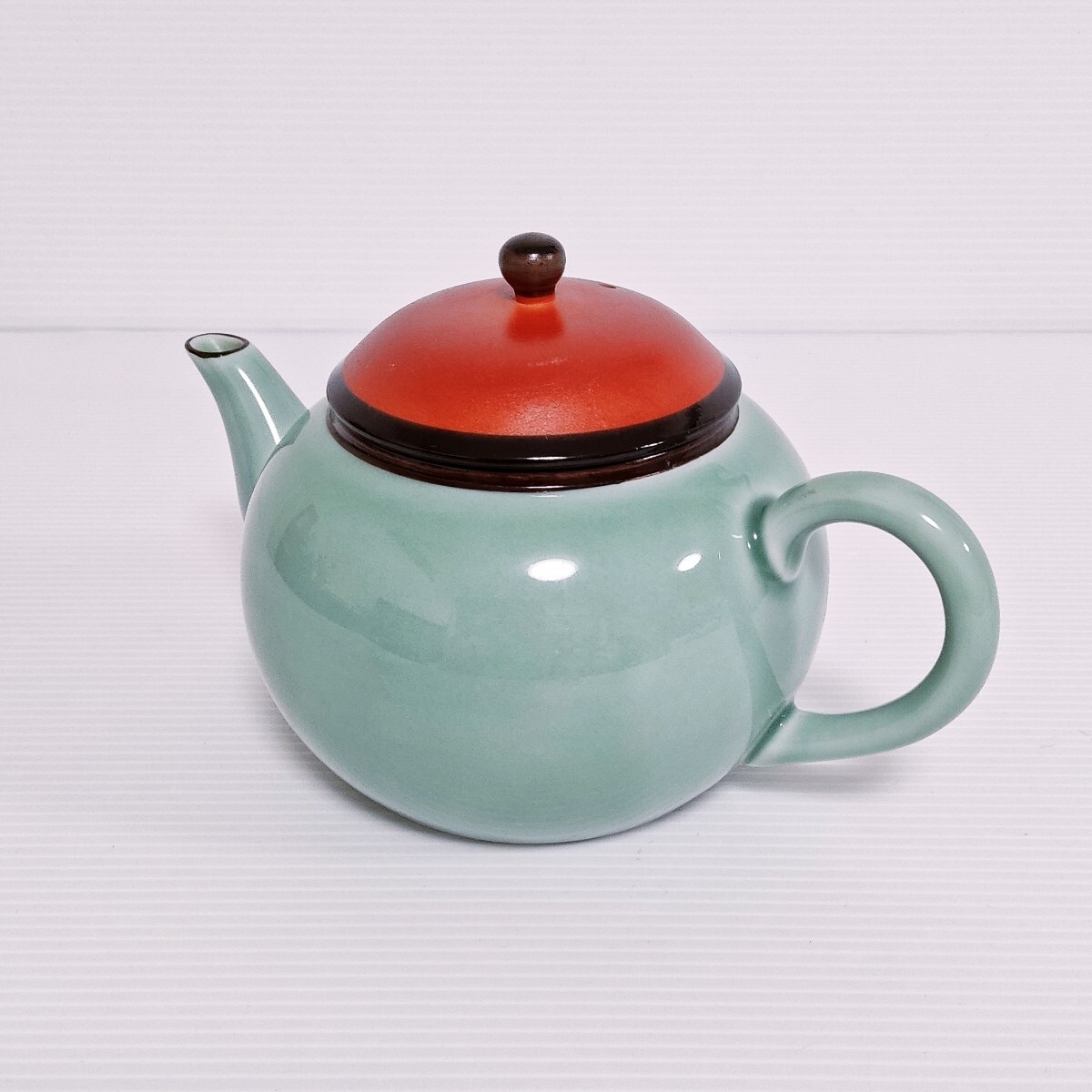 - 深川製磁 百年庵 笹青磁 朱泥蓋 後手 急須 煎茶道具 茶器 希少 【難あり】xy521566
