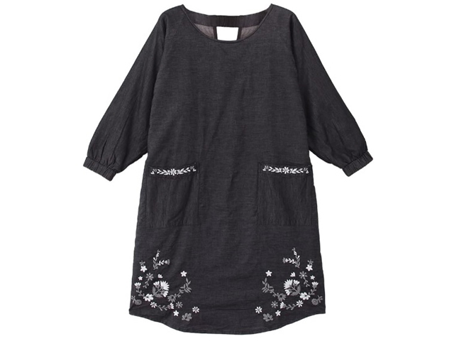 - 【送料無料】黒 4950円 デニムエプロン 割烹着 花柄刺繍